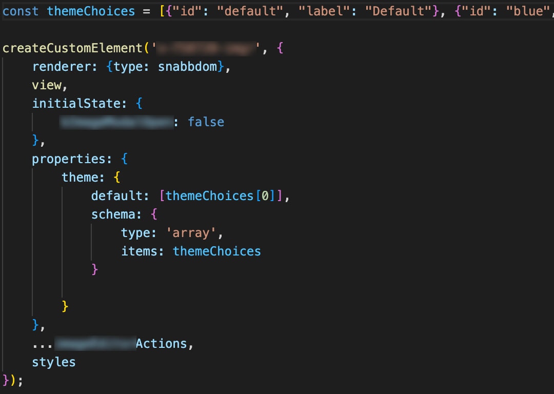 [Ideal: Implement a dropdown/choice list] After perusing some documentation and blog posts I tried to implement a dropdown instead. While I was able to get it to display, the choice list remained empty. I understand that in many cases choices can be added via references to entries within the sys_choice table but I want these to stand alone. Preferably set by myself within the boundaries of the component itself as a hard-coded array of key/value pairs for each theme preset.