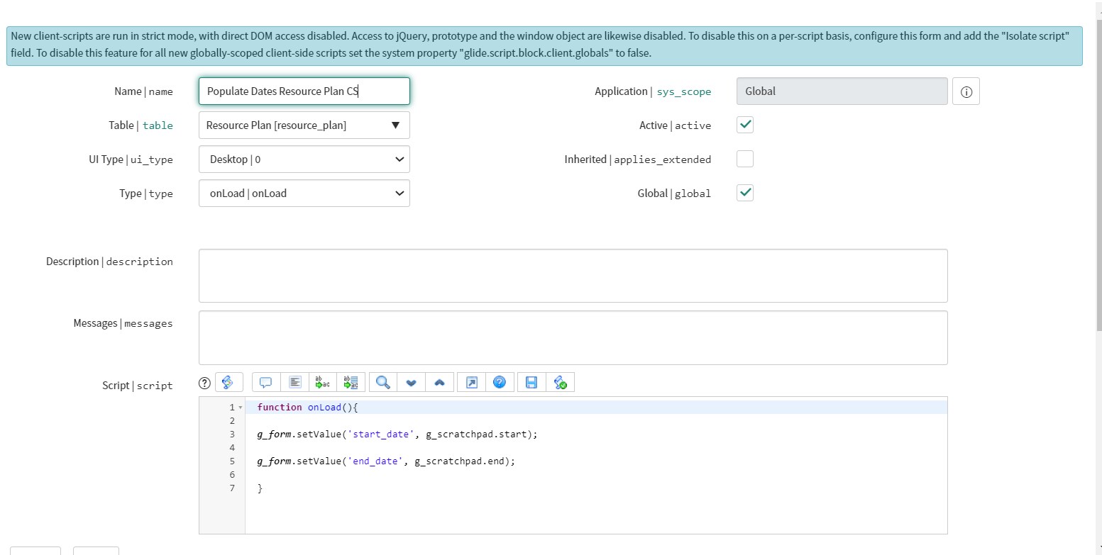 As well I added the Resource Plan table to the related list of my new table. Now I want to auto-populate the start_date and end_date field of the resource plan, I can create in the related list, with the gives dates of my related task.