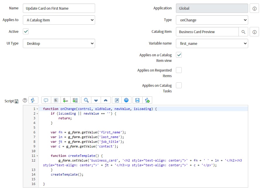 g_form.setValue('business_card', '<h2 style="text-align: center;">' + fn + ' ' + ln + '</h2><h3 style="text-align: center;">' + jt + '</h3><p style="text-align: center;">' + c + '</p>');