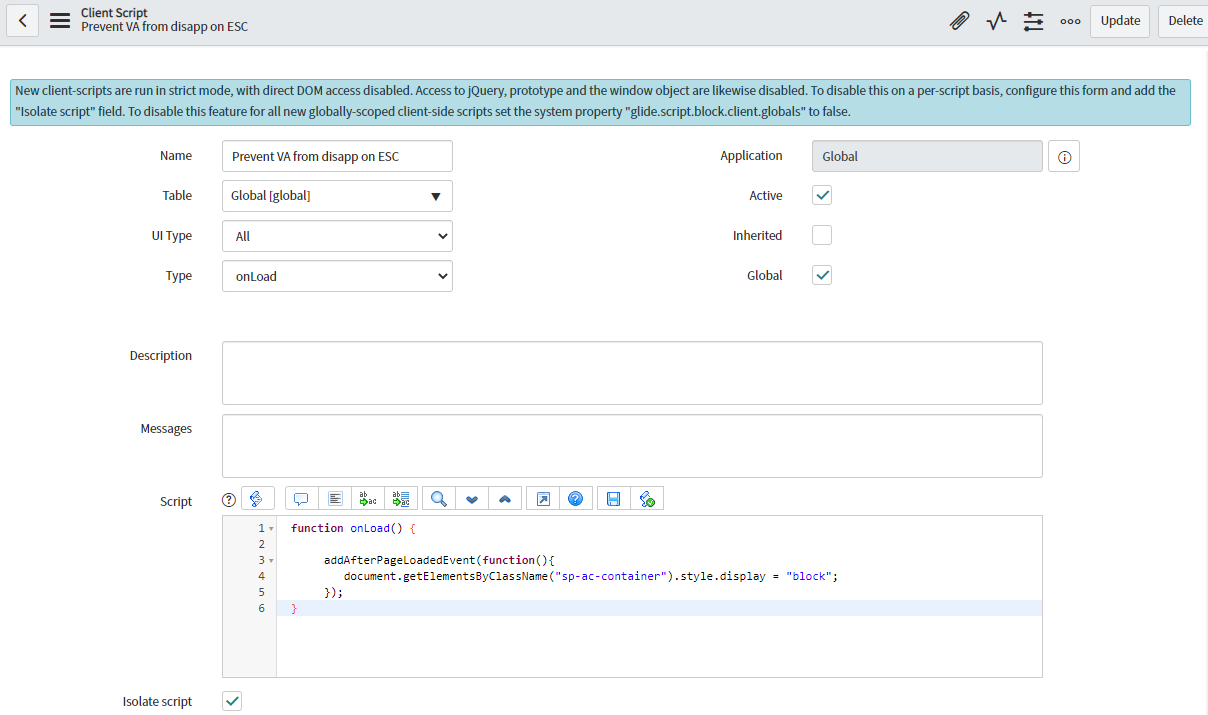 Now I'm thinking to remove that display attribute with a script as workaround; question is where it would work from. I've tried adding something like the below script to the client script of the VA widget. Nothing changed.