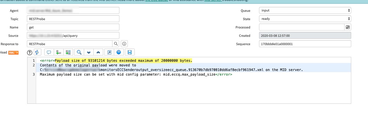 I make a call over the mid server that results in a response of 93MB file. This exceeds the threshold of 20MB and I get the below error (see first image below). I've tried adding the property called mid.eccq.max_payload_size as both a config parameter as well as a property (since you can do both) and it has no impact.