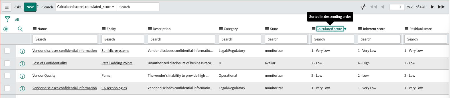 I found that the Risk Criteria field (out of the box its a translated field) lost his sorting capability on a list view or on a list report when we have more than one language set on the system. By checking the dictionary entry, I was able to check only the English label has been created for the field and said so, you are only able to sort the column if your user language is in English.