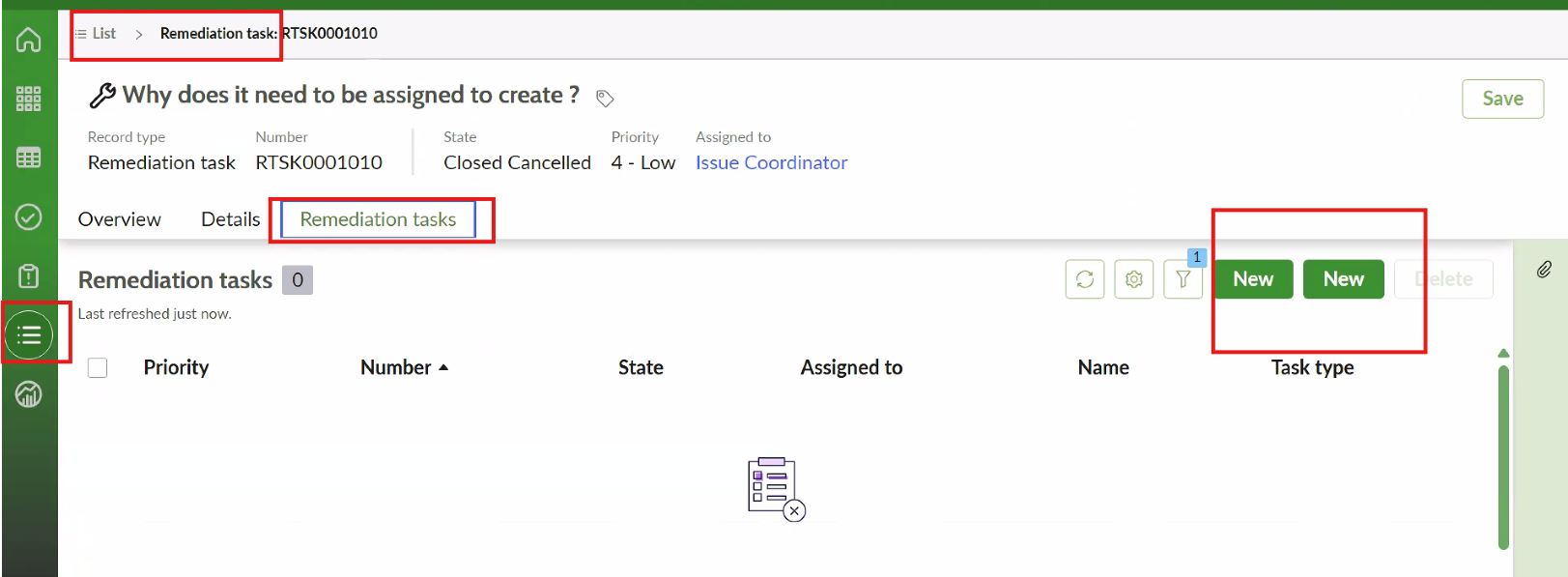 This behavior appears to be user-specific, as it does not occur for other users performing the same action. The duplicate New buttons appear when accessing the task record through the nested task list in Risk Workspace. This may indicate a role difference, UI configuration issue, or workspace component rendering problem.