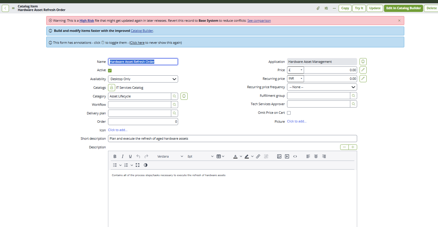 I’m trying to access an OOB feature from HAM Pro. There is an OOB catalog item called Hardware Asset Refresh Order, which has an associated flow. I activated the flow and tested it, but I’m getting stuck at the point where the sourcing task is supposed to be generated.