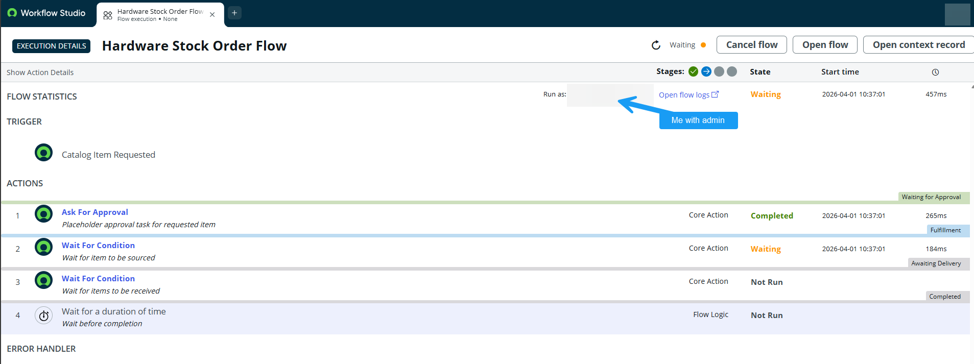 However, looking at our flow executions for the Source Request flow, they are all erroring. Looking at the flow engine context record gives me the necessary logs for troubleshooting my next steps.