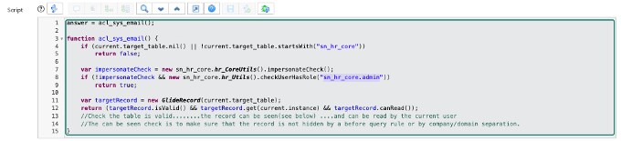 When an email is received in the instance, the inbound action “Create HR Case” looks at the property mentioned above to determine if this is an email address for HR. This inbound action sets the necessary fields and identifies the email as one intended for an HR Case. A script completes the Create HR Case inbound action. This step secures any email identified as an HR-centric email.