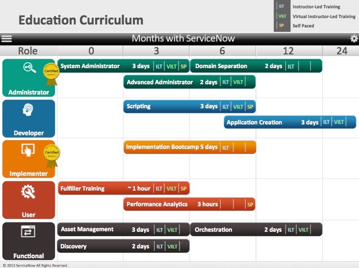 We are continuing to build out our technical training curriculum so if you have requests, please do not hesitate to send me an email or simply comment below. Here is a visual representation of our curriculum map - click on it to be taken to our page with all of the course descriptions:http://www.servicenow.com/training.do