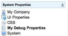 - If the navigation menu did not refresh automatically, click the refresh icon next to the "little A/big A" at the top of the menu. You should now see your "My Debug Properties" module under System Properties