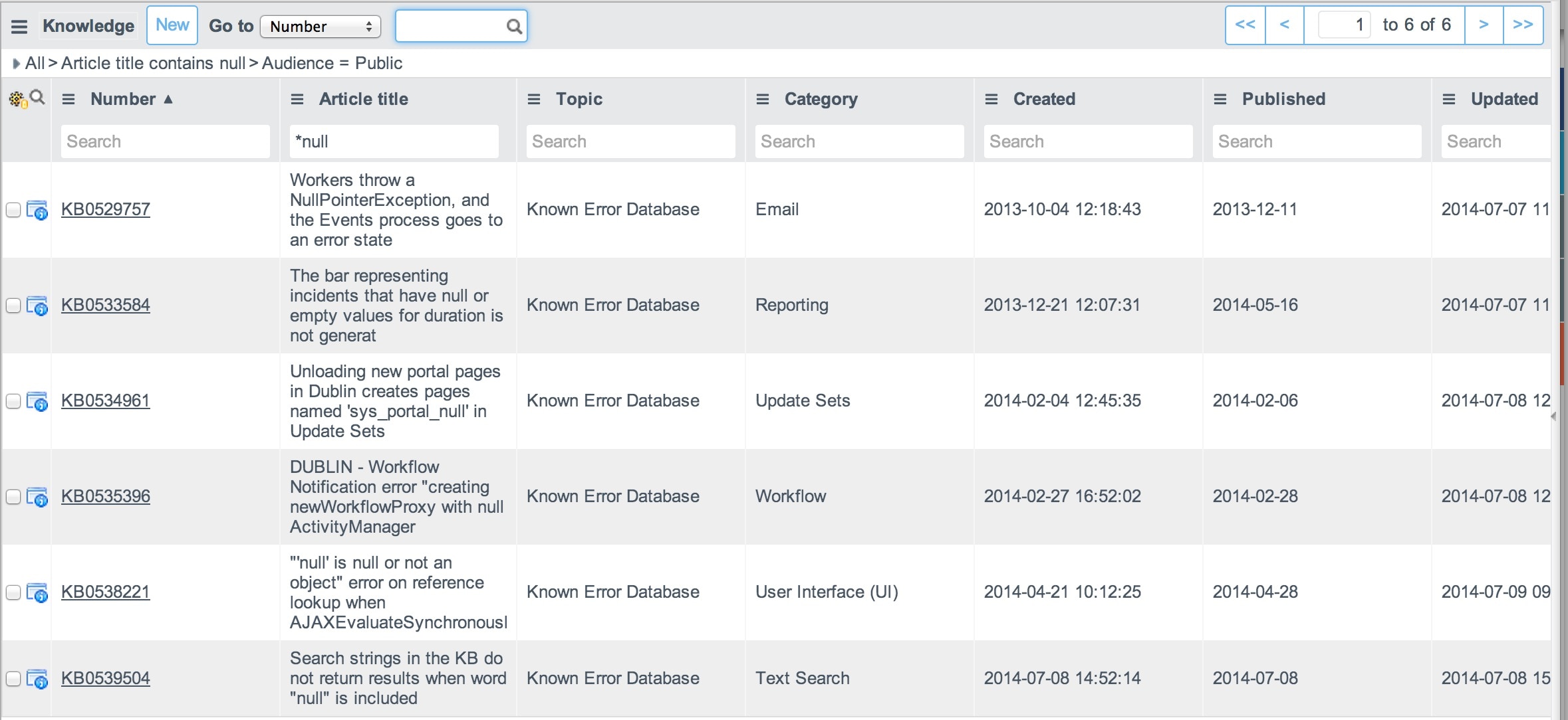 When filtering the Knowledge>Edit table for Article Title contains null> Audience = Public, there are 6 results: