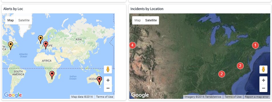 The screenshot below shows some maps added to the existing event overview dashboard. The map on the left depicts Alerts by Location — i.e. which user groups or data-centers are experiencing issues. The one on the right summarizes the number of open incidents by location (which may or may not have come from alerts).