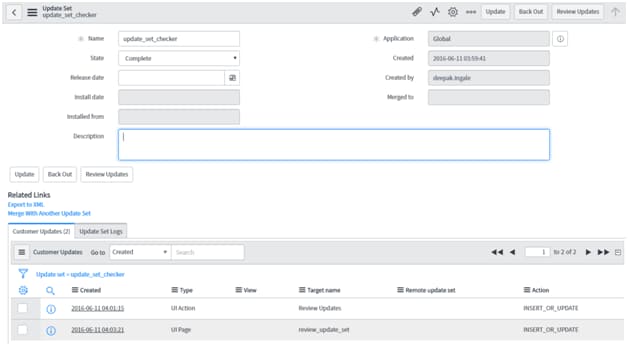 This complete process involves lots of clicks to review single update. I have created a small utility (update_set_checker) which lists down all the related customizations on a single page involving links to both record in XML format ("sys_update_xml") and actual record which got modified. This helps developers / reviewers to check customizations efficiently. This utility captured in update set has been attached here.