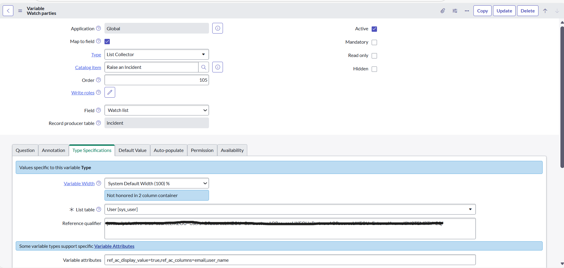 - Variable Attributes Tried : ref_ac_display_value=true,ref_ac_columns=email,user_name