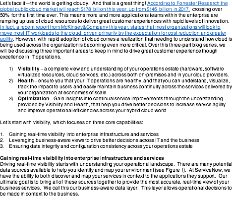 Let's face it—the world is getting cloudy. And that is a great thing! According to Forrester Research, the global public cloud market will reach $178 billion this year, u..., crossing over 50% for the first time ever. This means more and more applications teams within the enterprise are ramping up use of cloud resources to deliver great customer experiences with rapid levels of innovation. In fact, a recent report from McKinsey&Company this year states that most organizations will look to move mos.... However, with rapid adoption of cloud comes a realization that needing to understand how cloud is being used across the organization is becoming even more critical. Over this 3-part blog series, we will be discussing three important areas to keep in mind to drive great customer experience through excellence in IT operations.