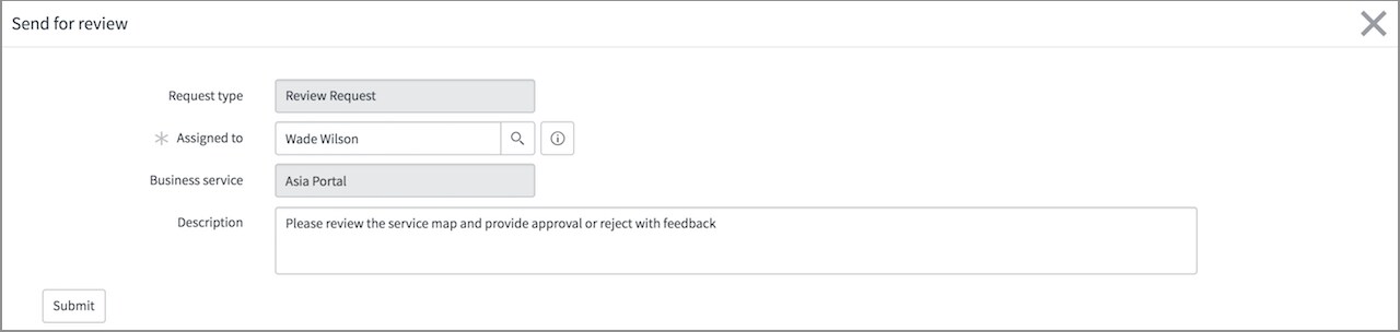 The Service Mapping Administrator is responsible for mapping, fixing, and maintaining Application Services and begins by clicking on the Send for Review button to create a review task assigned to the Service Owner:
