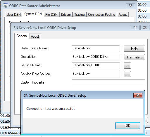 When I use the ISQL interactive SQL I am unable to connect to the database. I get an error saying "you are not connected to any database" (see attached screen shot). However if I go into the ODBC Data Source Administrator, go to SYSTEM DSN and configure the ServiceNow ODBC Driver 32-bit, the test connection is successful. (See other attached screen shot).