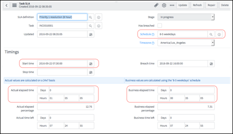 - Actual elapsed time shows that 1 hour 5 minutes 5 seconds have elapsed. This is the physical time that has elapsed since the Task SLA record was attached to the task record.