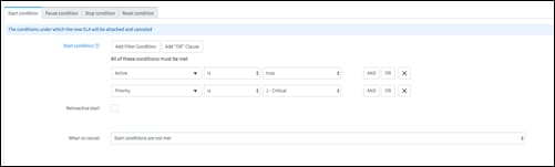 SLA condition rules control how the conditions you define in an SLA definition are combined to determine if an SLA should attach, pause, complete, reattach, or cancel.