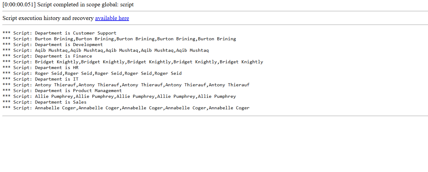 I need to fetch and print first 5 users from each Department the User table. Below is the script that I have written.
