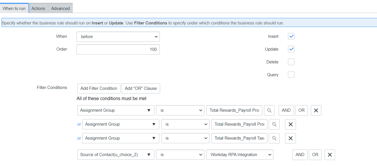 I recently created a business rule in our Test environment that we're experiencing issues with, I'm hoping someone can assist. The purpose of this business rule is to check if the Employee Number (u_reference_1 field) in newly opened incidents, previously had any incidents closed/resolved within 48 hours under the two specific assignment groups under the same Employee Number. For example, employee "John Doe" opens a new incident in the assignment group "Total Rewards", the business rule will check if employee "John Doe" had a closed/resolved incident (within 48 hours) under the assignment groups of "Talentcycle" or "Talentcycle Admin". If he does, the incident will automatically assign to the "Technology Operations" assignment group. If not, the assignment group will remain the same.