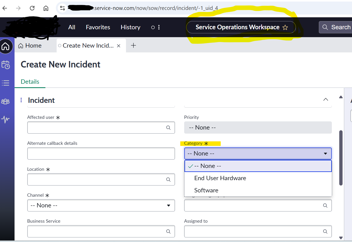 Category choices are not visible in the Service Operations Workspace, even though they are visible in the ServiceNow platform (standard UI).