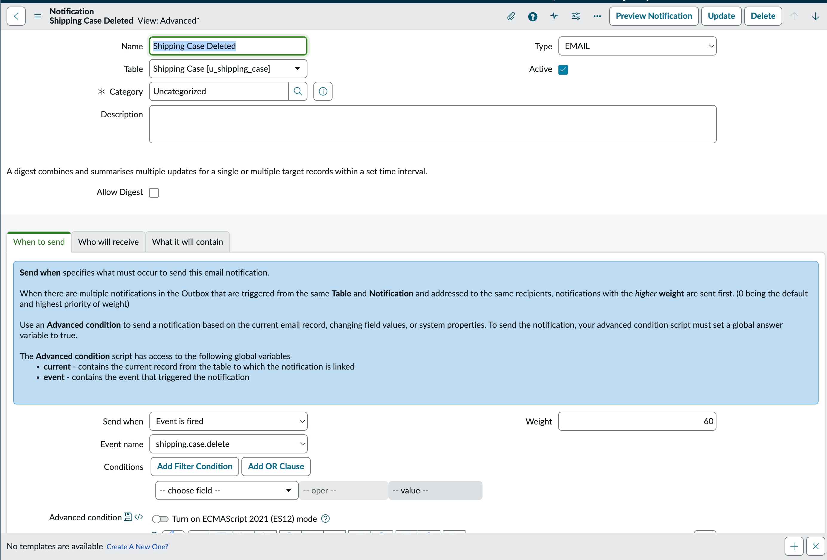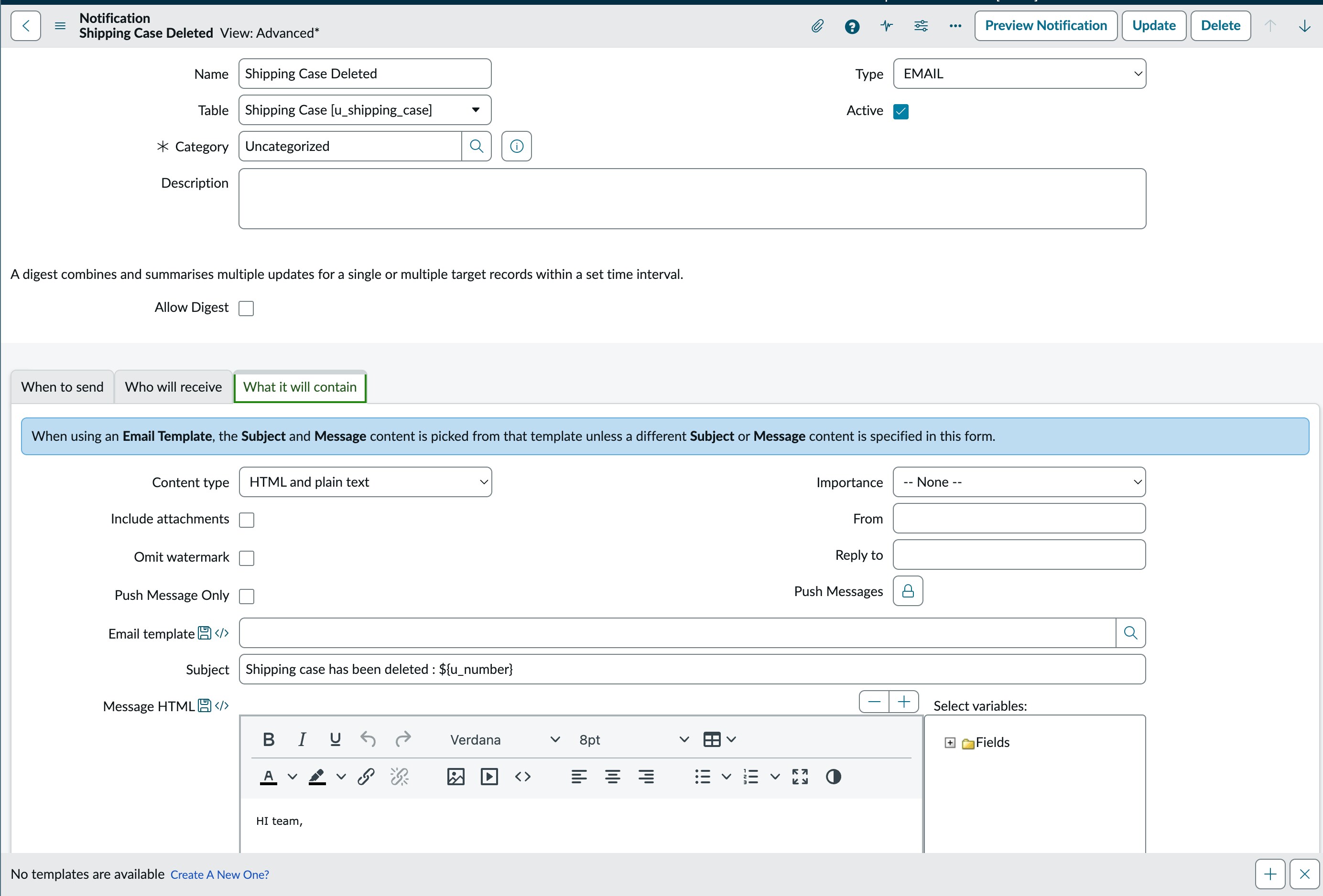 I just want a basic email notification whenever any record is deleted. In the email subject, I’m only using the record number to identify which record was deleted, so I’m not using any email script or advanced logic.
