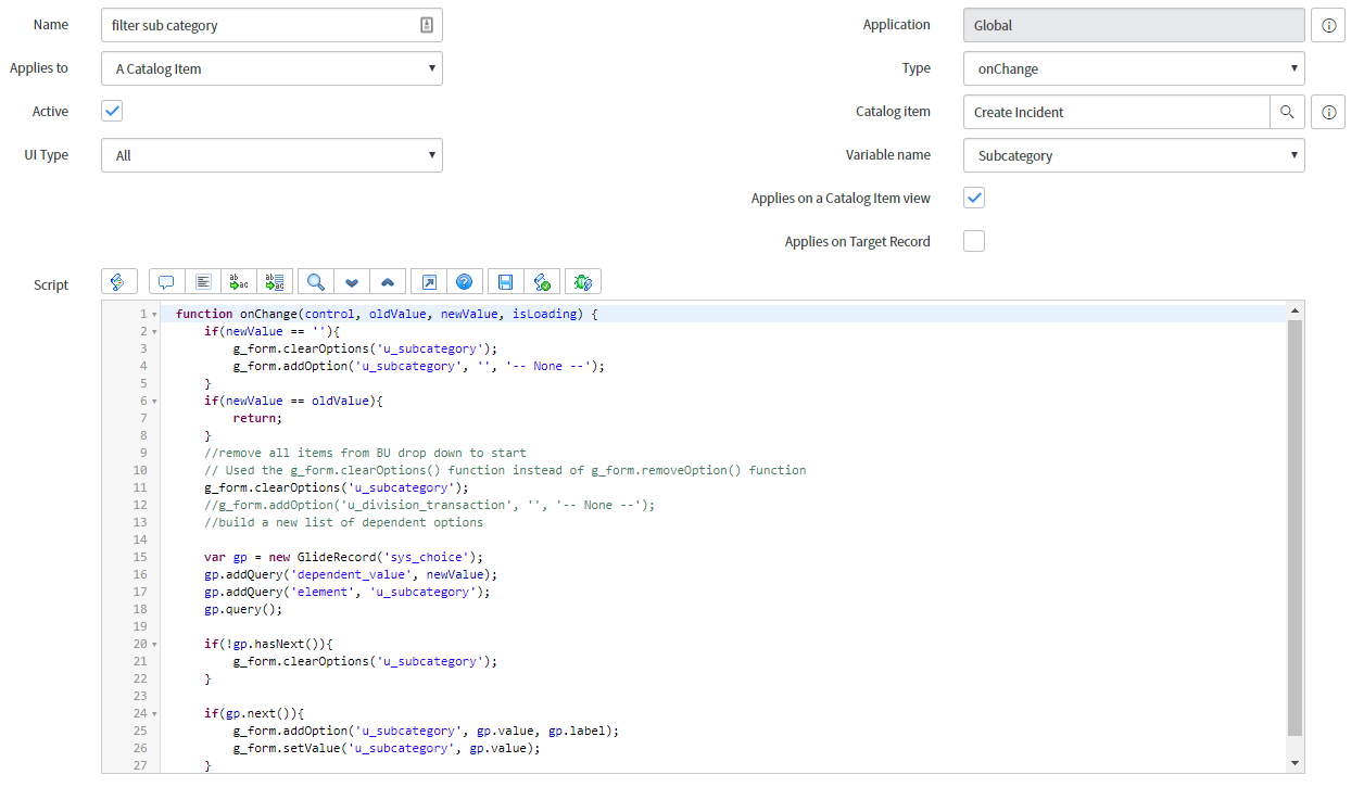 I've searched the community and found several different ways to approach this. I've tried using a reference qual and an on change client script but was unable to get anything working. Subcategory is dependent on category in the dictionary entry. All of my subcategories have dependent category values in the dictionary entry as well.