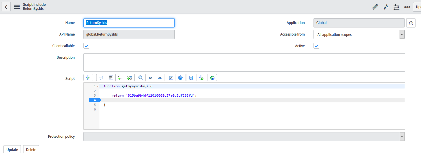The Script Include ReturnSysIds has a function called getmysysids() that simply returns a static string. The string is a sys_id of an existing TASK in my environment. The script include is in the Global application, is Active and is Client callable.