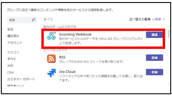 その他のオプション > コネクタ > Incoming Webhookを追加。