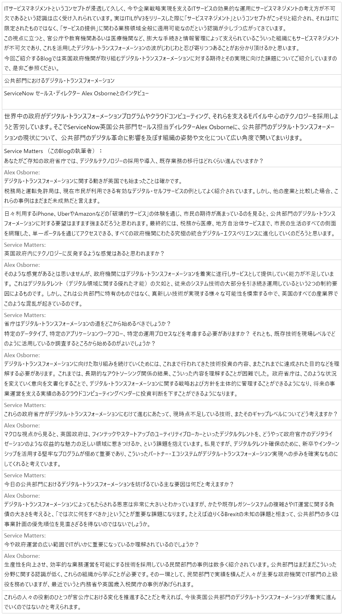 世界中の政府がデジタル・トランスフォーメーションプログラムやクラウドコンピューティング、それらを支えるモバイル中心のテクノロジーを採用しようと苦労しています。そこでServiceNow英国公共部門セールス担当ディレクターAlex Osborneに、公共部門のデジタル・トランスフォーメーションの現状について、 公共部門のデジタル革命に影響を及ぼす組織の姿勢や文化について広い角度で聞いてまいります。
