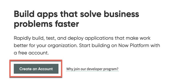 最初のステップは Developer Portal へのユーザー登録になります。Web ブラウザから Developer Portal (https://developer.servicenow.com/)にアクセスをして、ページ中央部分にある「Create an Account」リンクをクリックします。
