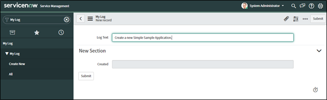 今回、フォームに新しいセクションを作成し、Createdのフィールドを追加しました。なお、前の手順ではLog Textフィールドだけ作成しましたが、ServiceNowでテーブルを作成すると、レコードの作成日時や更新日時などを記録するフィールドが自動で生成されます。