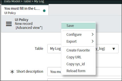 テーブルとShort descriptionが入力できたら、Studioのヘッダ部分で右クリックし、コンテキストメニューを表示します。メニューの中から[Save]を選んで、ここまでの入力内容を保存します。この操作は、フォームに関連リスト[UI Policy Actions]を表示させて、UIポリシーアクションを作成するために行います。