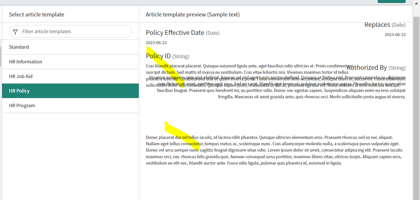 I am currently creating new Article Templates. I am testing the first one out. When I go to create a new KB article I select Create New->select the knowledge base->select the template an Article Template Preview (Sample Text) appears but not in English. I can't figure out how to change the language or how to remove the Article template preview in general.
