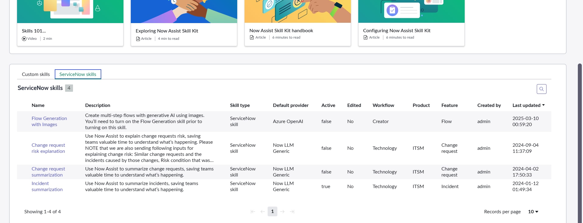 My instance’s ServiceNow Skills list (no KB generation skill visible)