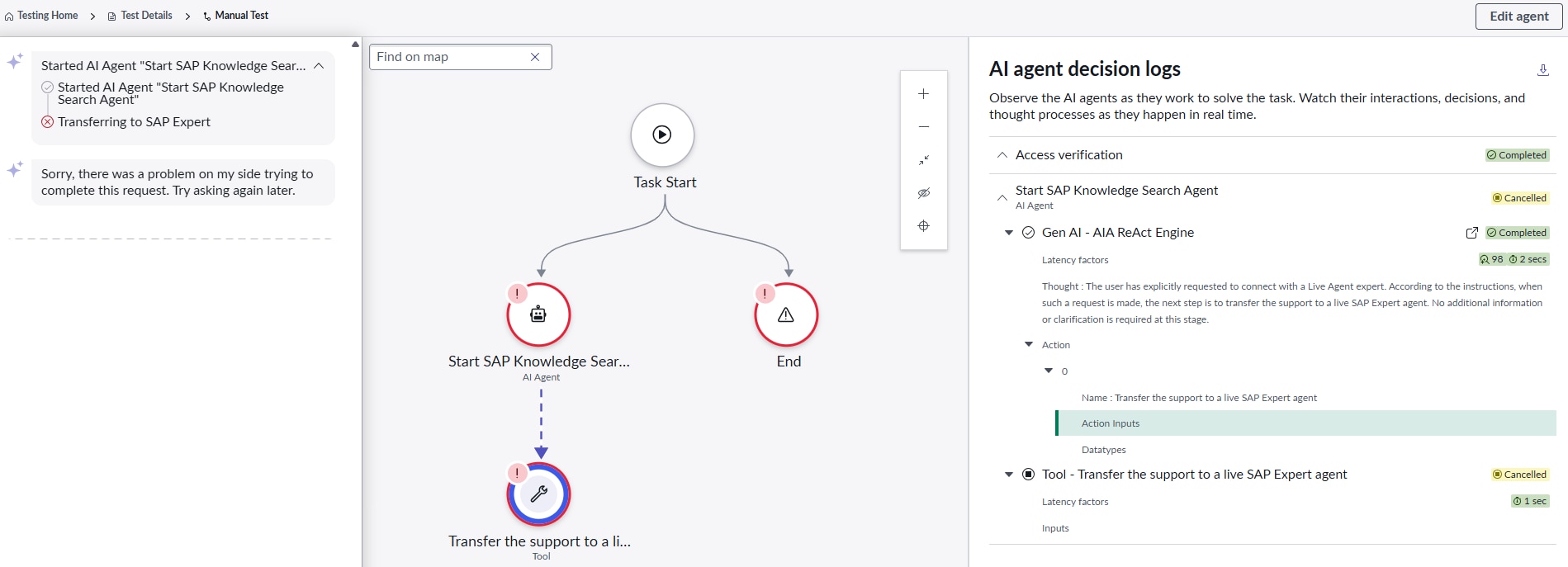 I'm struggling with a weird issue on AI agent. My AI Agent works great for searching KB articles and incidents, but it crashes every time it tries to trigger the ' Transfer the support to a live SAP Expert agent' topic.