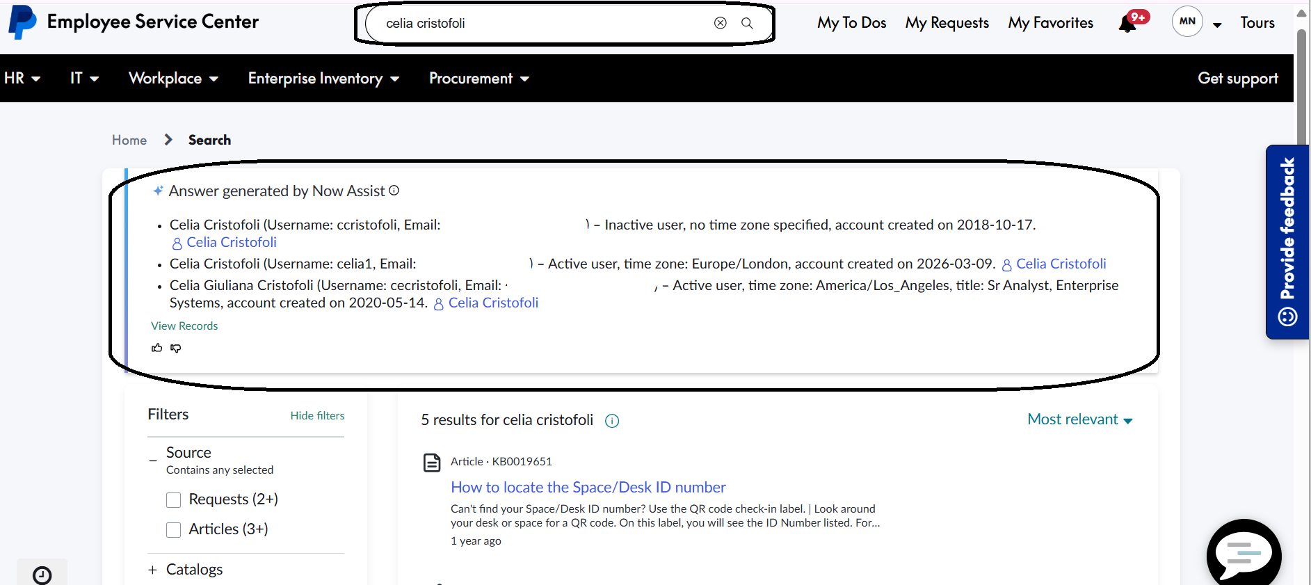 Now assist generated people search results should only display active users in ESC