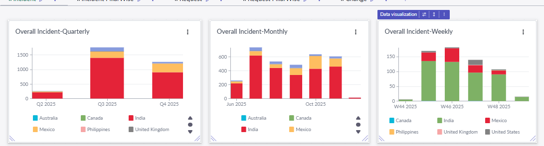 I have three bar charts (Quarterly, Monthly, Weekly) showing incidents by country.