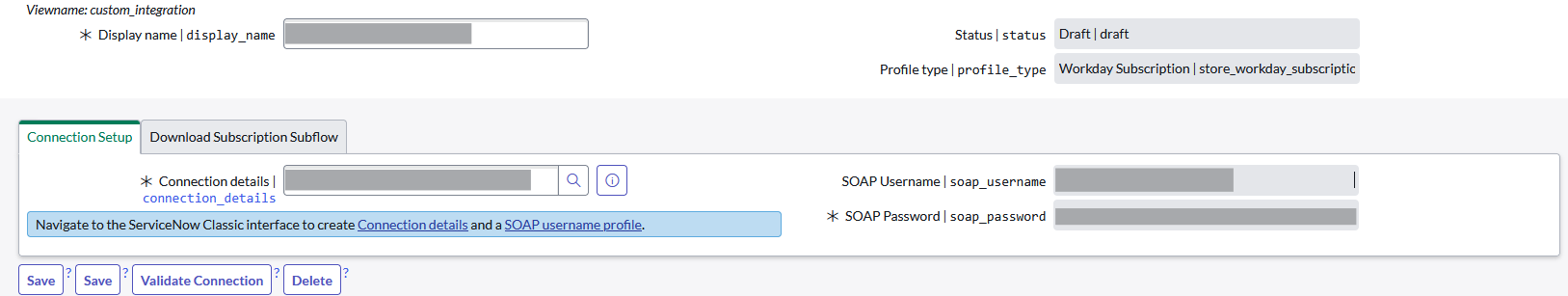 When creating the integration profile the connection details, SOAP username and SOAP password are prefilled. This looks to be caused by an existing Workday integration to another ServiceNow application. We are able to create a new set of connection details, SOAP username and SOAP password from the related tables. Our issue though is that we are unable to change the already prefilled SOAP username and password details on the integration profile. We can change the connection detail record though.