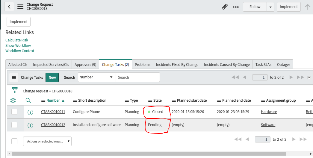 All Tasks are now in state "Pending", but as soon as you fill in the assignment group an click on "Request Approval", the Change is waiting for approval.