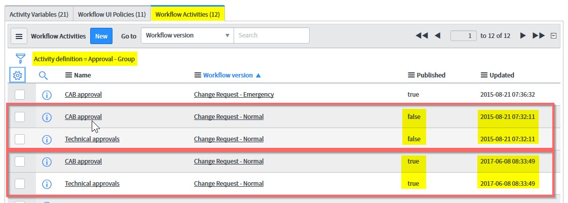 Here, you can see, that the "Approval - Group" Workflow Activity is used in the "Change Request - Normal" Workflow - a total of four times. As you can see in the column "published" (on the right side), TWO are published and TWO are NOT published - each with the same timestamp).