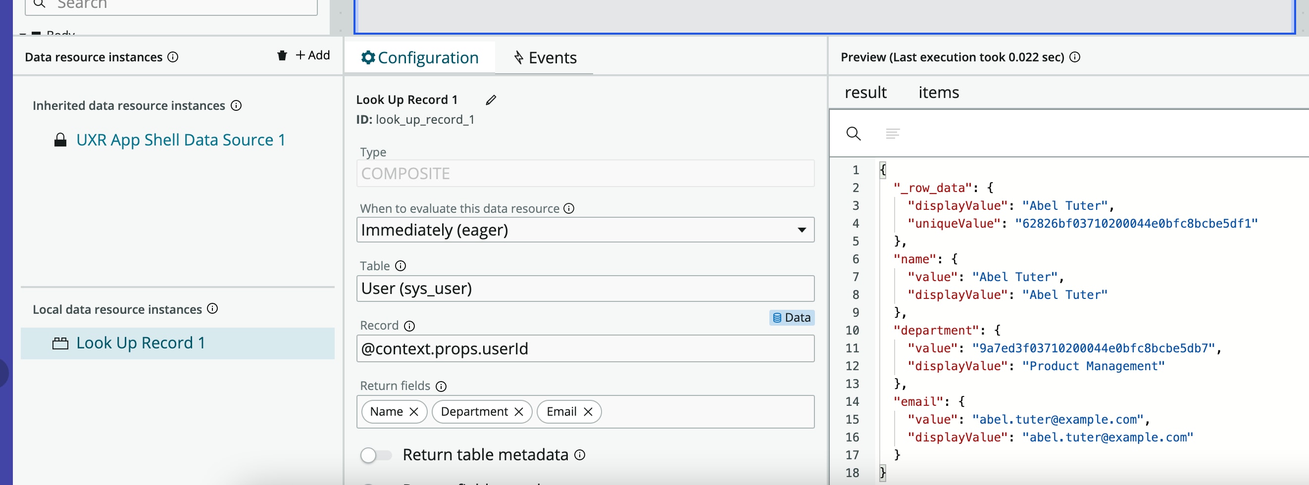 21. Staying on the config tab for the body component, an input text field for your property will appear 22. Click the dynamic data binding resource icon a. Notice if you start typing @context, you can add your page parameters from the parent page to the child page 23. type @data, and you should see your inherited data resource available in the type ahead 24. You could select either result or items but I will select result a. Note: You can append/dot walk, .name.displayValue for example, to store just the name data in the page property. When displaying the user's name on the page later, you only need to type @data.parameterName. If you do not choose to bind the lowest level data in the JSON object to your page parameter, you can type @data.prameterName.name.displayValue into the text field of the object you wish to display the user's name later on. b. In my example, I chose to bind the entire JSON object in the page parameter