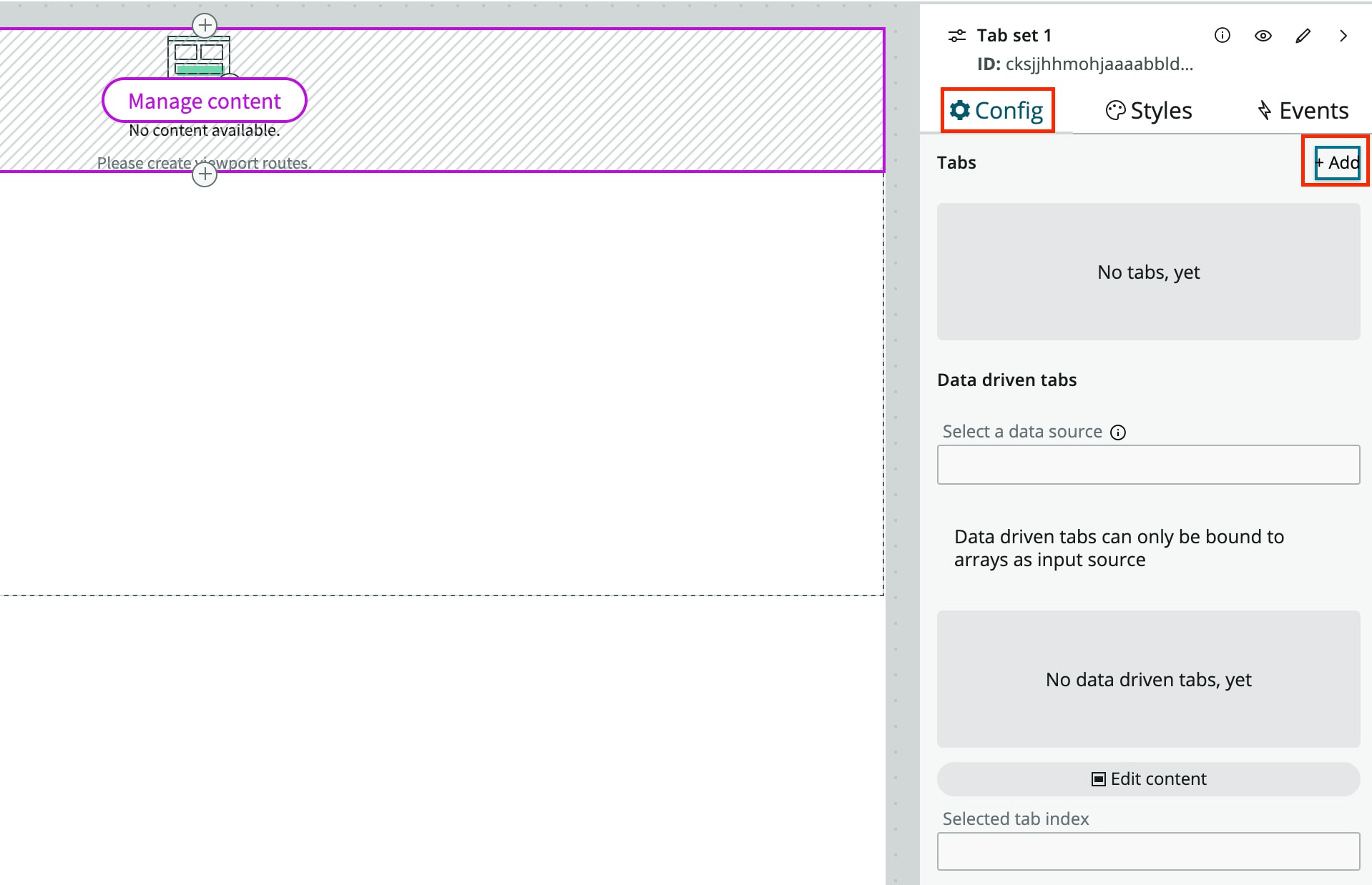 4. Now select the tab set 5. On the right pane, under config, click +Add | |