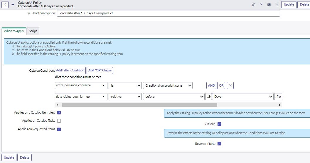 If the user selects "creation of new card" then I want to force delivery to be after 180 days from the current date, and if a user selects "Modification of existing card" then I want to force delivery to be after 30 days from the current date. Below is my UI Policy along with the short script used.