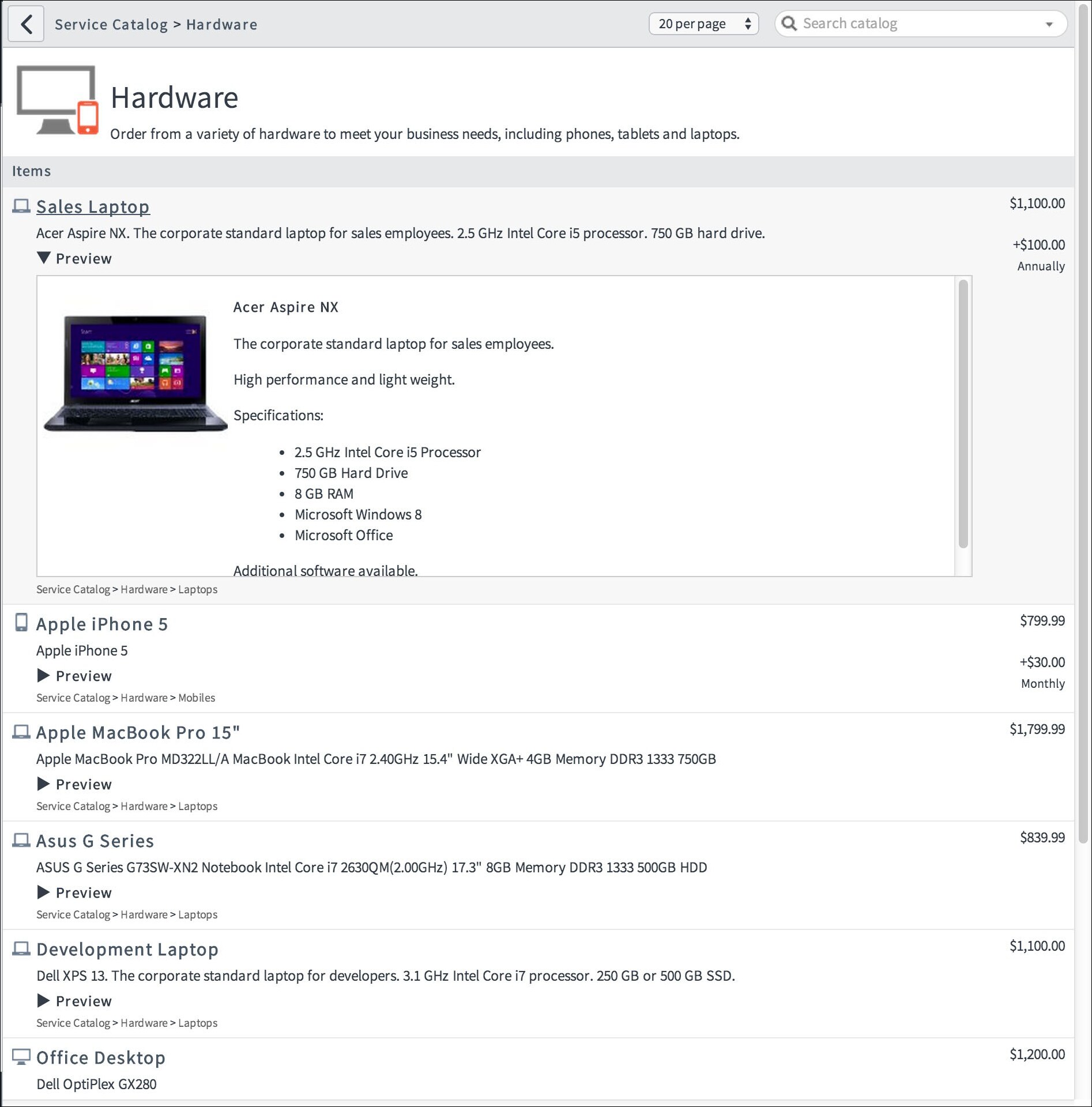 The more quickly your users can move through the catalog, find what they want and place their order, the sooner they can get to the important part of their work. You can choose to display as much or as little preview context to your end user depending on your goals for the user experience. The catalog gives you these three options to configure how you would like your item details displayed.