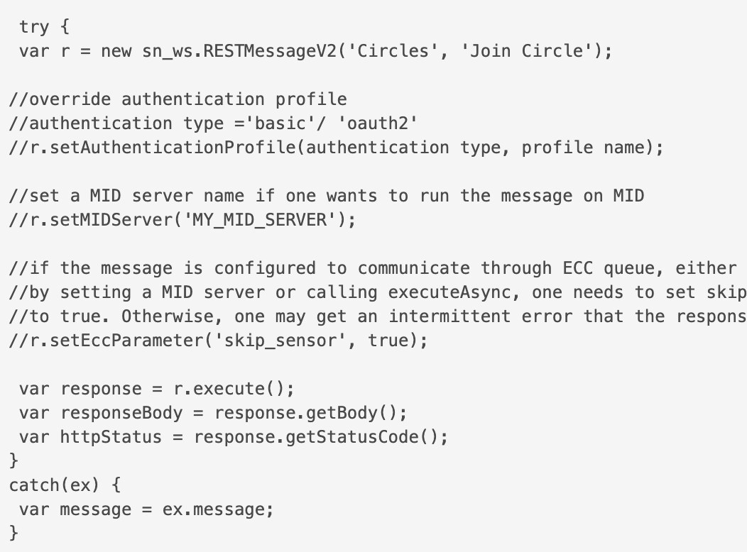 Scripting in ServiceNow is done via JavaScript. If you’ve ever used Workflow, you might remember the laborious effort of scripting around your REST requests. You might have to write 20 lines of code to get anything done. Still, it was better than having to do everything from scratch. Via the RESTMessageV2 API you could script most communication for the REST requests. For example, if you wanted to get details about a particular book using its ISBN number, here’s how you did it: