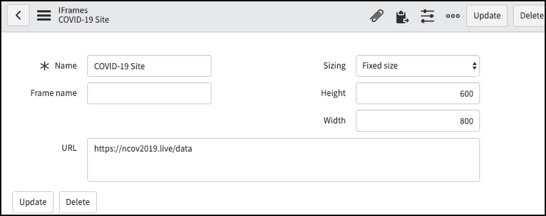 Once that is added, we need to configure the iframe. (this requires content_admin to manage Content Blocks). All we need to do is give it a name, enter the URL (https://ncov2019.live/data), and set the height and width. IFrames with external content do not auto-resize, so you must pick something that will work for most of your users.