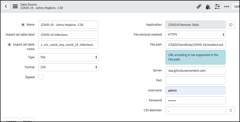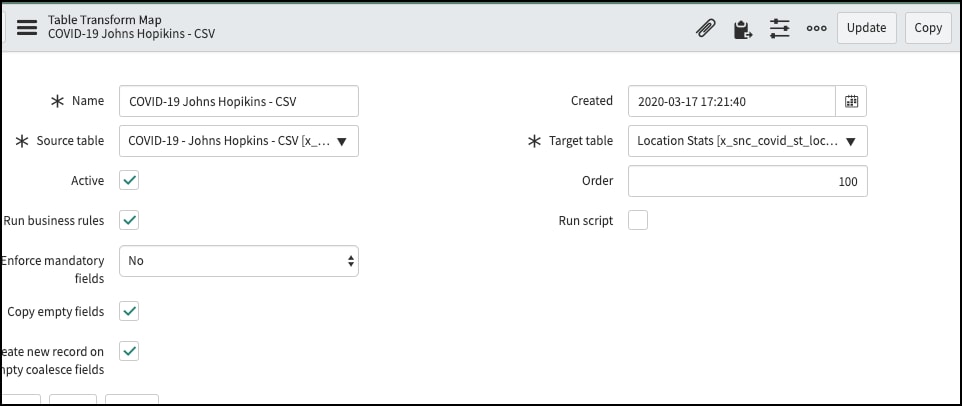 Nothing special is required for the field mappings, but for this data, I coalesced on last updated, country, and region (being sure to allow blanks for these). I also used a script to look up the location from cmn_location.