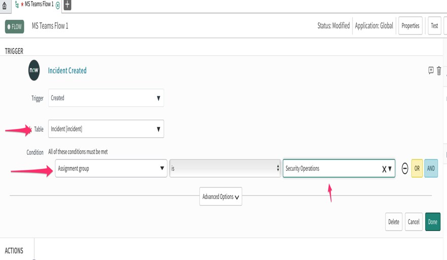 The Security Operations team primarily uses Microsoft Teams for team communication. They have asked about leveraging Microsoft Teams to see incidents in ServiceNow. You want to create a flow that takes all new incidents assigned to the Security Operations assignment group and posts them into a Microsoft Teams Channel.