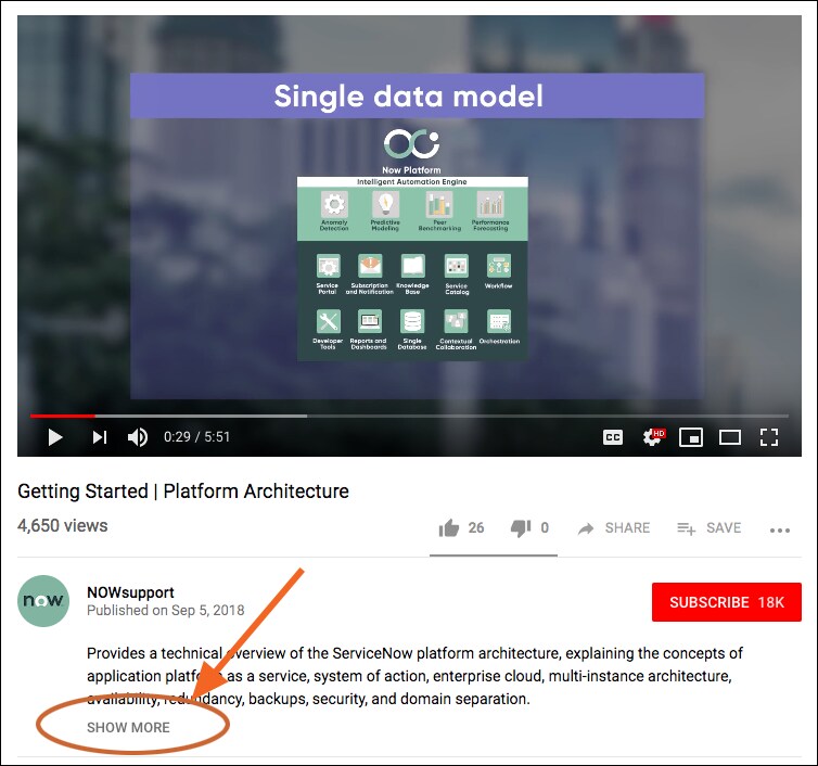 Clicking SHOW MORE in a video’s description on our NowSupport channel in YouTube ...
