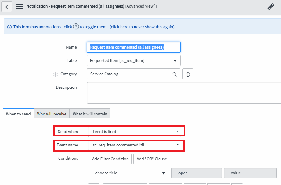 Your Send When will be "record inserted or updated" or "triggered". 90% of the time you're picking "record inserted or updated". "triggering" has to do with the Flow Designer, which I'll get to later. If you pick "record inserted or updated", you're presented with a condition builder from which you determine the rules for when the notification works. Easy peasy. Fill out your recipients and content fields and this notification is good to go.